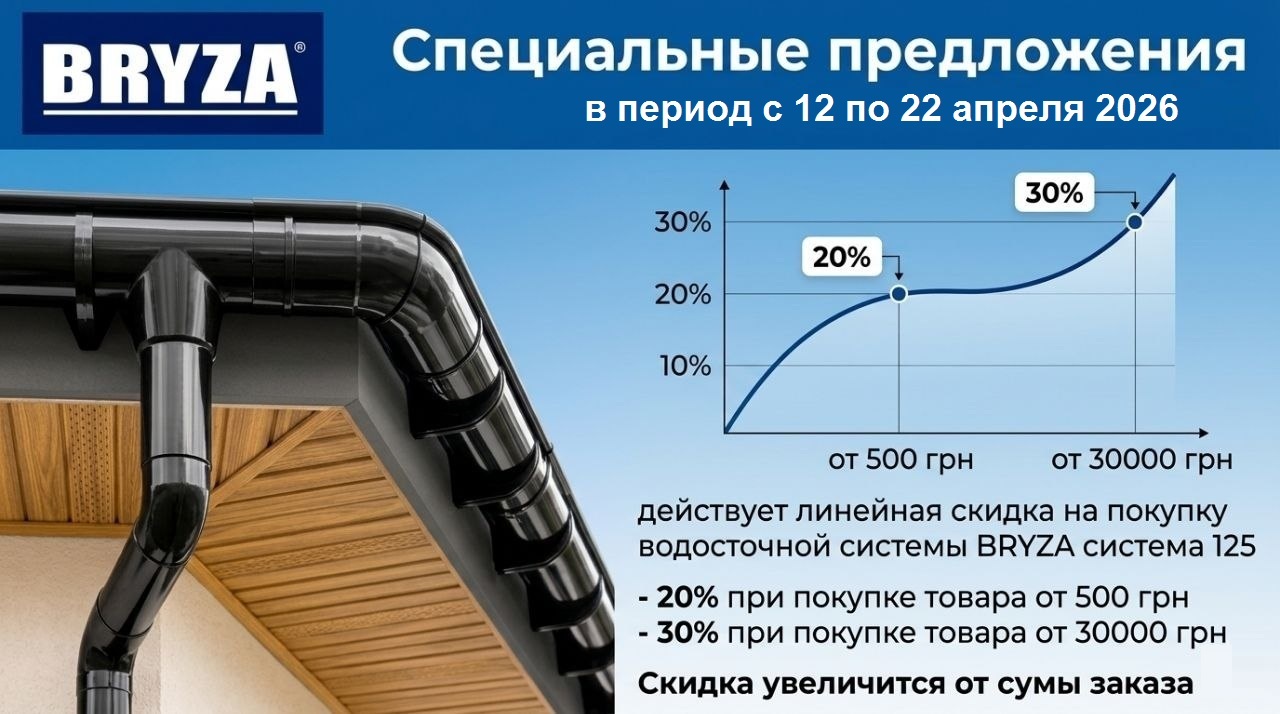 Только с 12 по 22 апреля 2026 года у нас действует уникальное предложение на водосточные системы BRYZA (система 125). Ваша экономия растет вместе с вашим заказом!